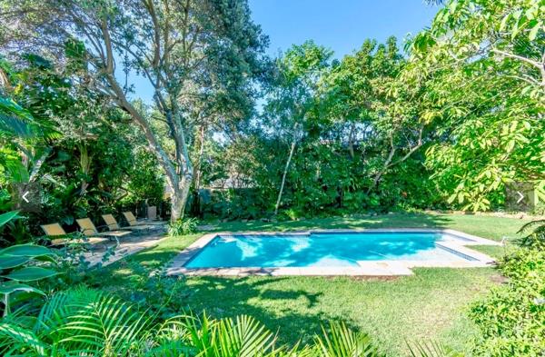 Step outside to an expansive outdoor entertainment area, featuring a generous patio and deck seamlessly connecting to the interior via bi-fold doors. Enjoy a private swimming pool set amidst lush tropical landscaping, offering a secluded oasis. Direct private beach access via a wooden boardwalk leads to stunning ocean views. With a communal braai area, staff quarters, and two garages, every convenience is considered for a luxurious coastal lifestyle.