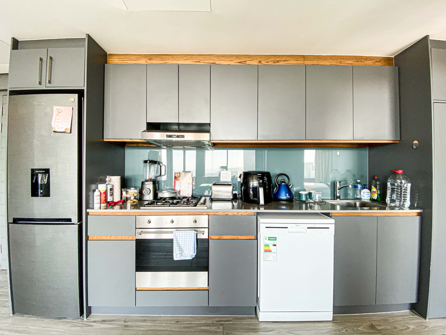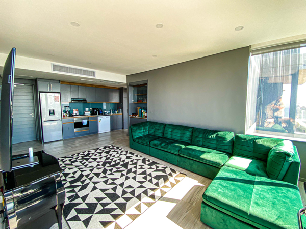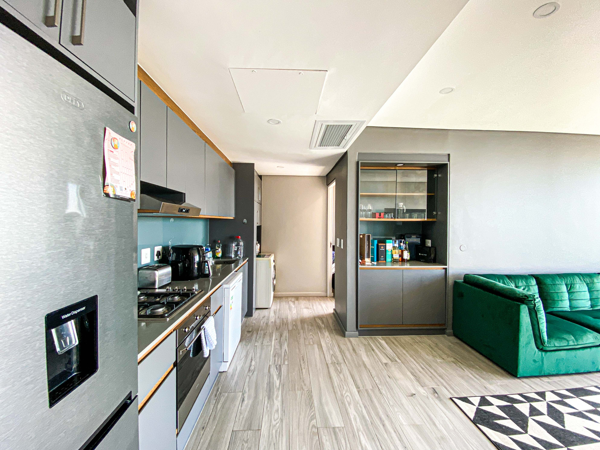 A beautiful open-plan kitchen with fitted top-of-the -range appliances, dining area and lounge all leading out onto a balcony.