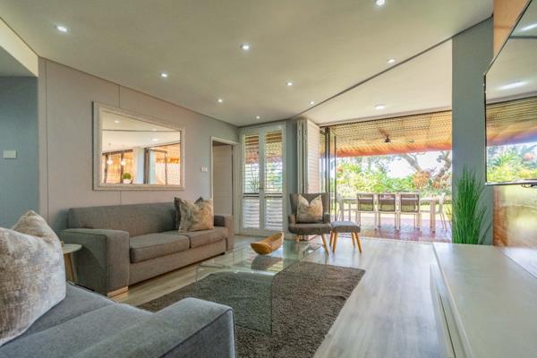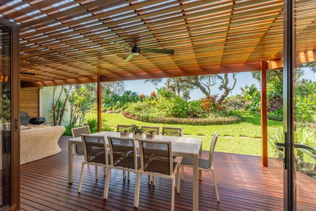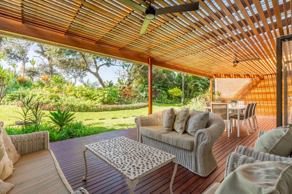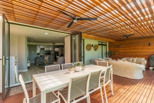 All living areas extend onto an expansive, covered entertainment area, complete with a rich wooden deck, warm tones, and a wooden awned pergola an inviting outdoor space that merges beautifully with the manicured garden and enjoy the ocean beyond. A sleek conversation counter, positioned just off the lounge, connects directly to this space through seamless stack-back windows, creating a fluid indoor-outdoor connection ideal for relaxed gatherings and evening sundowners.