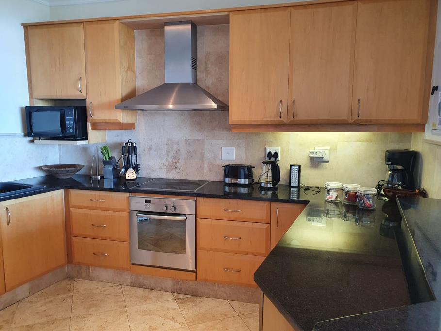 Open plan kitchen granite counter tops lots of cupboard space plus electrical appliances.
