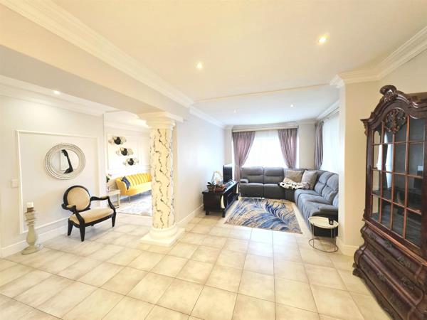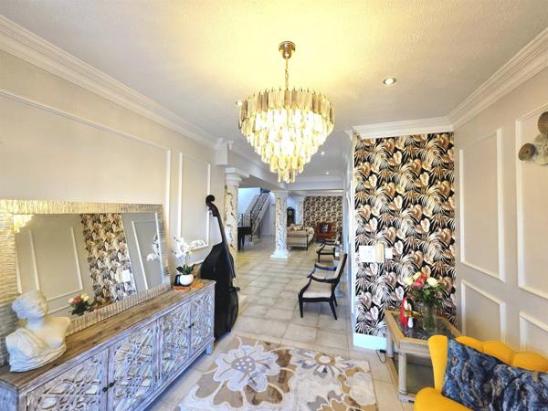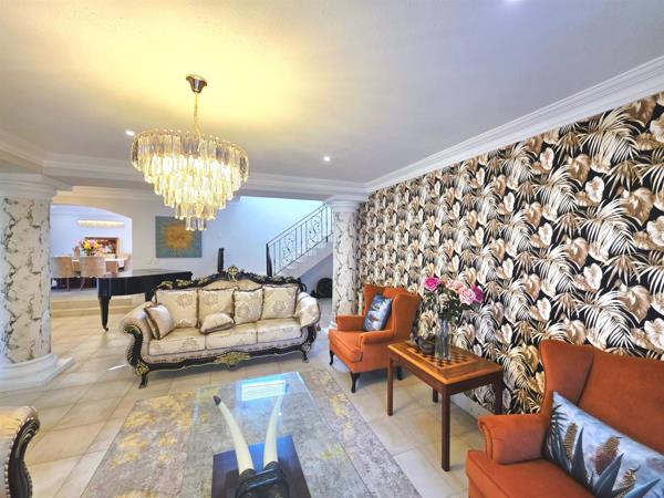 Chandeliers and statement lighting throughout. Unique wallpapered feature walls and detailed ceiling cornices. Beautiful staircase with wrought-iron detail. Air-conditioning, security features, and loads of storage.