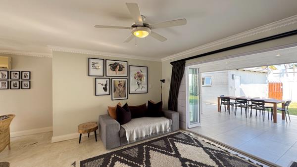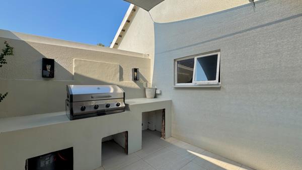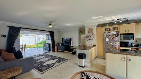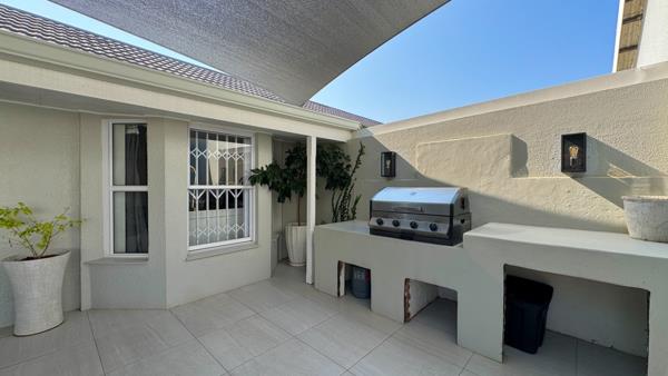 The open plan lounge, dining, and granite-top kitchen area flows seamlessly to a covered patio complete with a built-in braai, bar area, and an expansive private garden. Tiled throughout, the home is fitted with air conditioning and ceiling fans in the lounge and all bedrooms for year-round comfort.