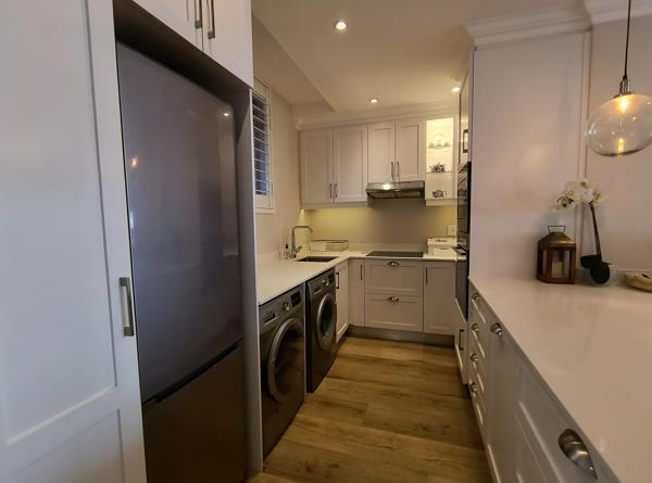 The kitchen has been updated with Caesarstone countertops, a dishwasher, washing machine, countertop stove, eye-level oven, and ample storage space. Each bedroom has built-in cupboards, an en-suite bathroom, carpeted floors, and plenty of light that can be cleverly tucked away behind the Mediterranean blinds when needed.