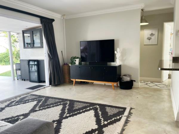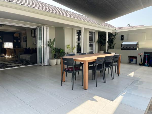 The spacious open-plan living area flows seamlessly onto a large covered patio with stack doors the perfect setting for entertaining and enjoying Durbans warm climate. The patio has been designed with a braai area, a bar space, and a stylish sail awning, creating a balance of shade and light.