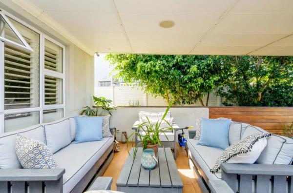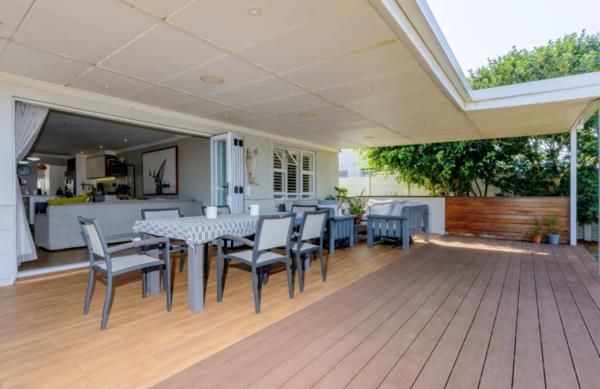 The open-plan kitchen, finished with sleek Caesarstone countertops and a gas stove, flows into generous living and dining areas. Stackable doors open out to an inviting patio overlooking a beautifully landscaped garden, creating seamless indoor-outdoor living with sweeping sea views.