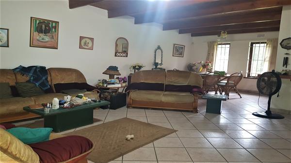 Inside, discover a spacious open-plan living and dining area, highlighted by rustic wooden beamed ceilings and practical tiled flooring. Abundant natural light streams through multiple windows, all fitted with security bars for peace of mind. The functional kitchen, equipped with essential appliances and ample lower cabinet storage, includes a convenient pass-through opening, enhancing connectivity with the main living spaces. The home comprises two comfortable bedrooms, each featuring tiled floors and natural light. One bedroom offers direct outdoor access via a large glass sliding door with security bars and includes an air conditioning unit. The two functional bathrooms, one with an enclosed shower, cater to daily needs. Security is a priority, burglar bars throughout the home. The property also boasts a private garden, an integrated garage, and is pet-friendly with a fence.