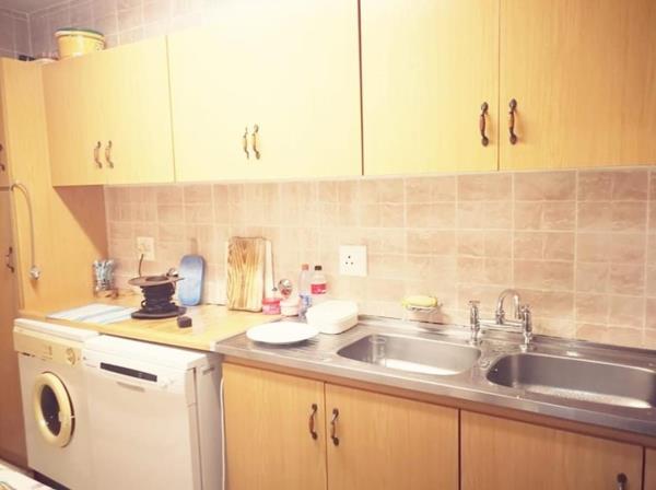 Scullery featuring a double sink and included appliances: double-door fridge, washing machine, tumble dryer, and dishwasher go with the sale of the house. Guest toilet for added convenience.