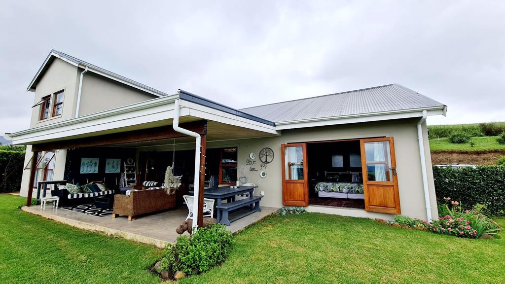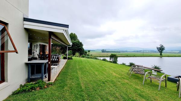This is a secure estate and the beautiful modern home is on the banks of the Twin Lakes of the Peatties Lake Resort. With magnificent views the calm water across the hills of Karkloof. The home has super modern finishes. Downstairs is a wonderful open plan living area with the open beam ceilings and stack doors onto the lovely undercover patio and rolling lawns to the waters edge. The main bedroom has French doors opening onto the same view and a large open plan bathroom/dressing room. The bedroom wing with three more bedrooms is on the other side of the living area giving great privacy.