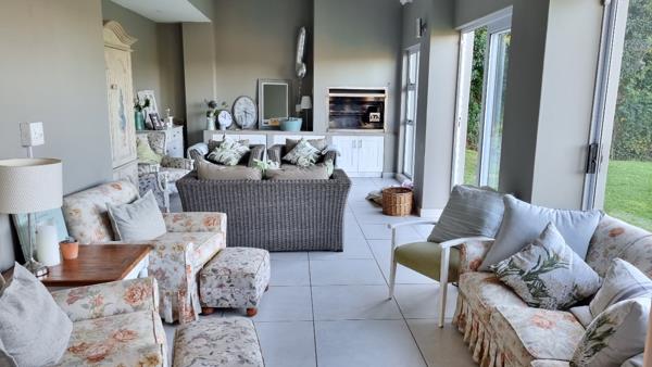 Downstairs comprises an elegant hallway / reception area, a step-down lounge, open plan dining area, a well appointed kitchen with separate scullery area and laundry (and no shortage of cupbards or storage space), a sunroom with indoor braai facility overlooking the garden and rolling lawn, a guest toilet facility and a guest bedroom with en suite bathroom and a double garage that includes additional space for a workshop.
