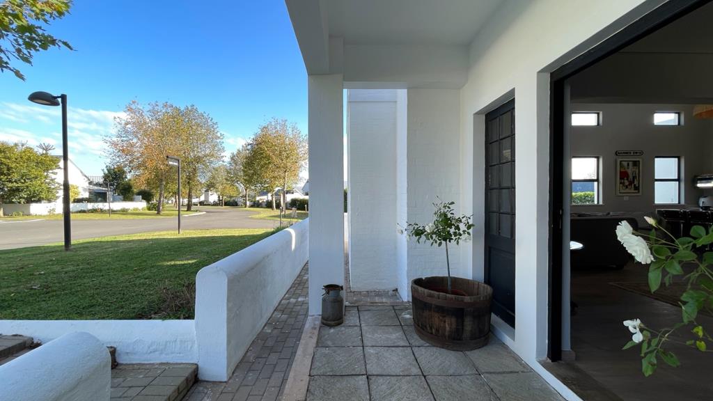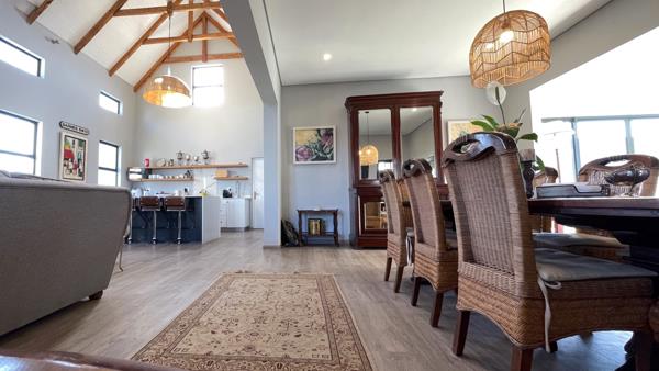 High ceilings with exposed reclaimed yellowwood beams and contemporary lighting add charm to the lounge, while the modern kitchen features white Caesarstone countertops, sleek cabinetry, and a striking central island. A separate scullery provides added convenience.