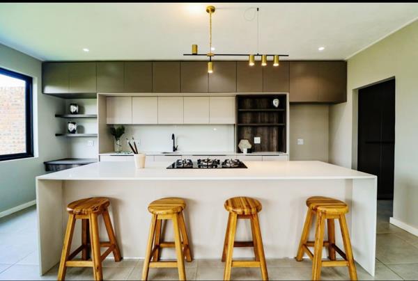 The two outdoor relaxationentertaining spaces on the opposite end of the units also provides options for outdoor enjoyment in different climate and weather conditions. The one outdoor area comprises an exclusive use front garden that will offer views onto an undulating grassland area that has been preserved within the estate. The second outdoor area is set on the roof of the double garage providing an elevated rooftop garden that will provide panoramic views of the Drakensberg and Kranskloof mountain range, with beautiful sunset views. The modern style kitchen has a separate scullery as well as access to a courtyard area.