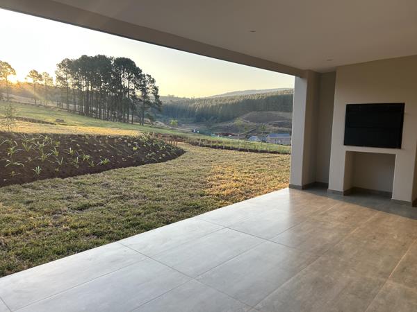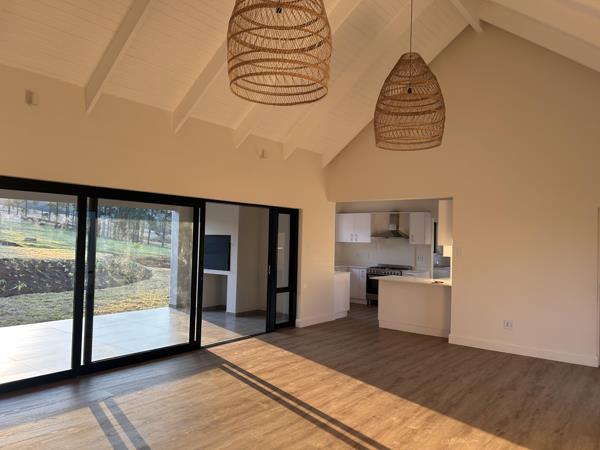 The home features three spacious bedrooms with vinyl flooring and built-in cupboards, complemented by two elegant bathrooms, including a main en-suite. The open-plan living area flows into a sleek kitchen with gas hob and separate scullery, while sliding doors lead to a covered veranda with built-in braaiperfect for entertaining.