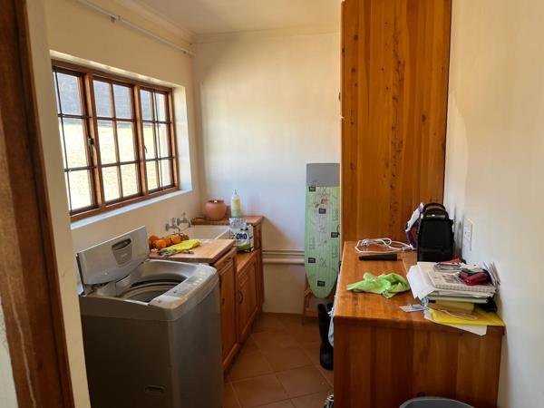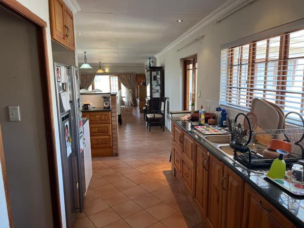 2,5 ha of gently sloping land leads up to the elevated, expansive homestead. The main home consists of kitchen (granite tops, downlighting, UCO and hob) and scullery (double sink), open plan to dining room and sunken lounge, with the bedroom wing leading off from the living area. There are 3 bedrooms, a large bathroom (an easy ensuite conversion off the main bedroom is possible, if required), an impressive wrap-around, covered patio in an L-shape, double garage (manual doors), and fiberglass-lined pool. The living area has a gas fireplace, laminated flooring and tiles in the dining room and kitchen.