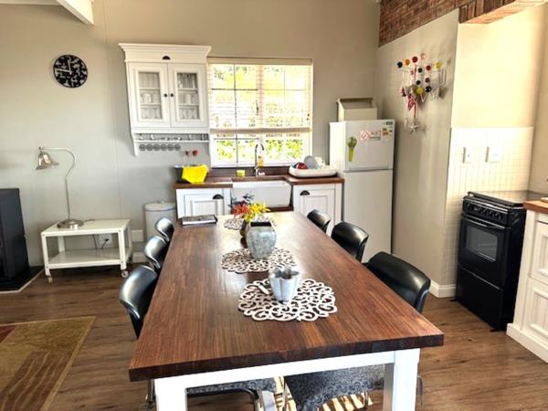 Cottage Two: One double bedroom, one-bathroom, full kitchen, lounge, dining area, and private patio with braai