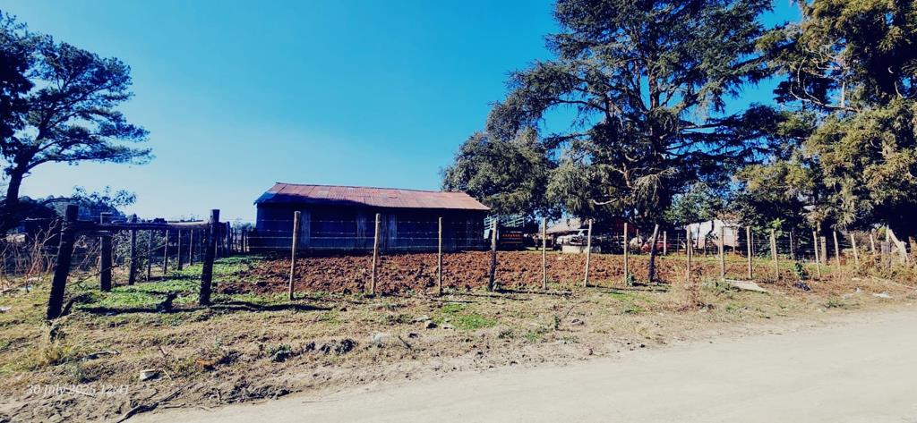 The property features a main dwelling, a car port, a shelter for equipment, and a small packing warehouse, providing the necessary infrastructure for a farming operation. The entire perimeter is securely fenced and clearly demarcated, outlining the property''s boundaries.