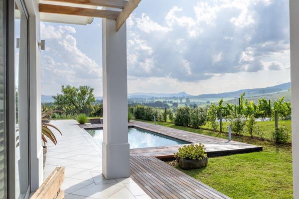 DUAL MANDATE: Positioned within a working vineyard at Highgate Wine Estate and framed by sweeping mountain views, this beautifully curated 300 m² home delivers an exceptional standard of refined, single-level living. The expansive indoor living spaces flow effortlessly onto a standout outdoor environment designed for relaxed entertaining, where a wraparound covered verandah, built-in braai, sunken firepit and striking pool deck combine to create a tranquil, yet social retreat immersed in nature.