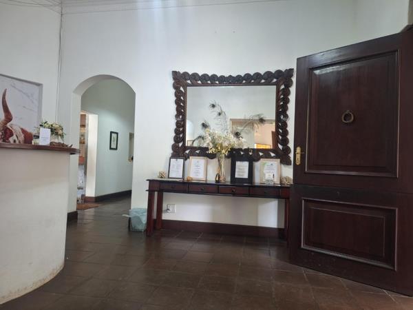 The interior features a welcoming entrance hall leading to two spacious lounges, a dedicated dining area, and a rustic yet elegant reception space. Two well-appointed kitchens, a pantry, guest toilet, air conditioning, and a cozy fireplace ensure comfort and convenience throughout.