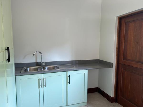 The kitchen is equipped with top-tier finishes, including quartz countertops, a premium gas hob, electric stove, and elegant wooden cabinetry. A spacious scullery with double basins and ample storage adds functionality, with a dedicated laundry area and additional cupboards provide convenience.