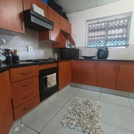 The kitchen is the heart of the home, featuring sleek granite countertops, a practical scullery, built-in cupboards, and modern appliances, including an under-counter oven and hob with an extractor fan. Its seamless connection to the open-plan lounge creates an inviting space for entertaining or simply unwinding. The lounge, with tiled floors, an air-conditioner, and a ceiling fan, opens out to a lovely patio thats perfect for relaxing after a busy day.