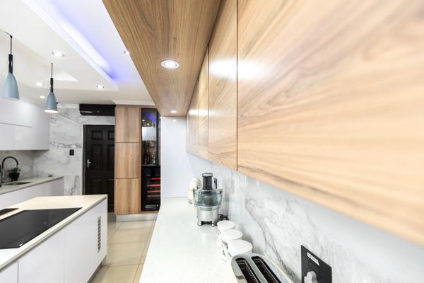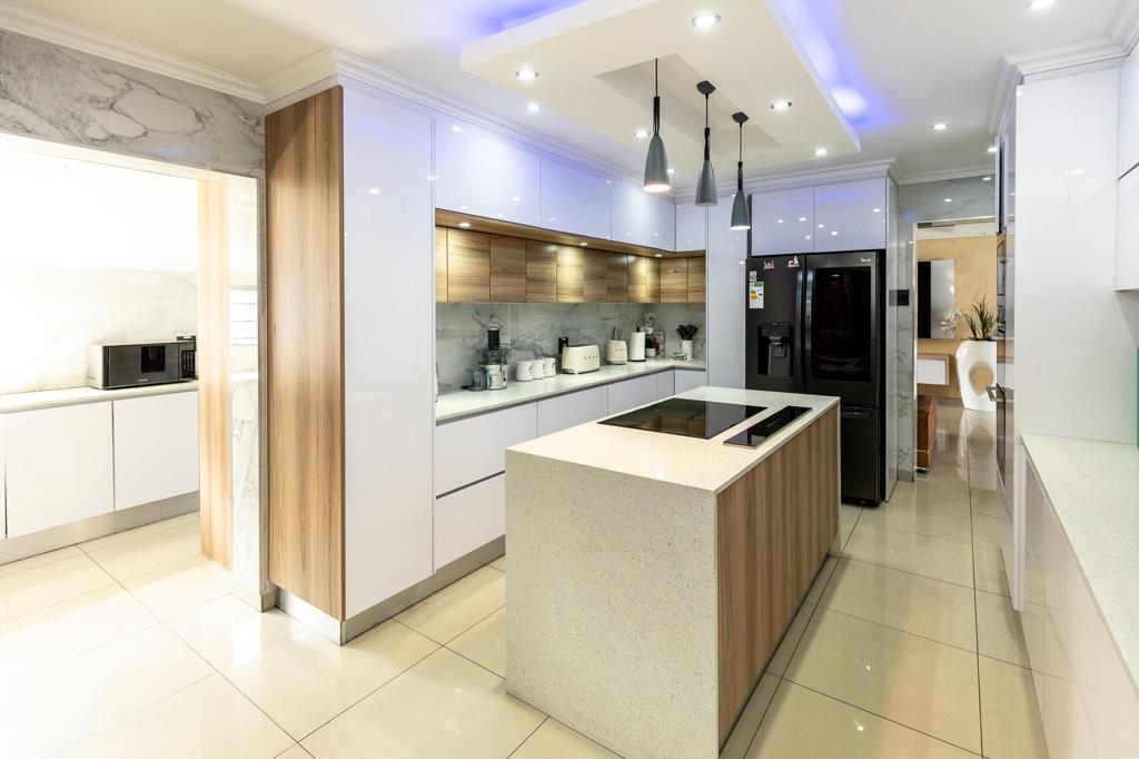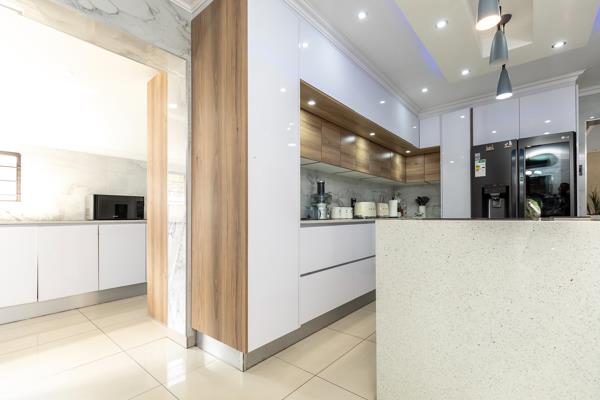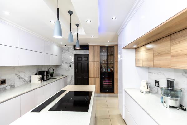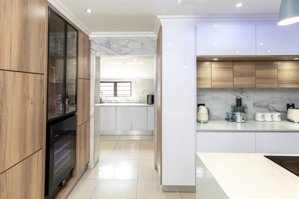 The home features five 5 bedrooms, complemented by a thoughtfully planned layout. The open-plan lounge and dining area creates a seamless flow, enhanced by stacked doors that open out to the pool area, making it ideal for both everyday living and family gatherings. A modern kitchen with tiled walls, granite tops, and a separate scullery ensures functionality while maintaining a clean, stylish finish.