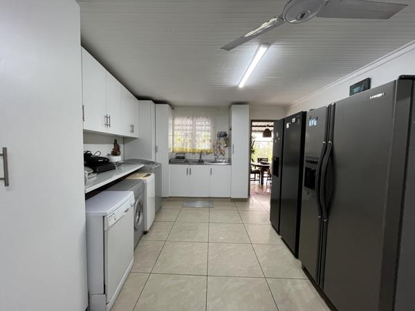 Inside, youll find a stylish, well-appointed kitchen with plenty of cupboard space and a large scullery perfect to cater for a large family. The open-plan lounge and dining area flow effortlessly to a covered patio featuring a built-in braai and an outdoor bathroom, creating an ideal entertainment space overlooking the sparkling swimming pool and outside garden patio.