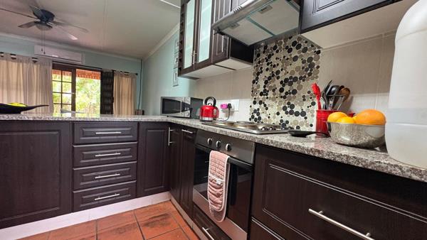 The home features 2 bedrooms, 1 bathroom, and an open-plan kitchen seamlessly flowing into the lounge and air conditioners in rooms and living area.
