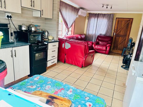 Boasting a fully tiled and fitted kitchen with built-in cupboards, a lounge area, one bathroom, and 3 bedrooms.