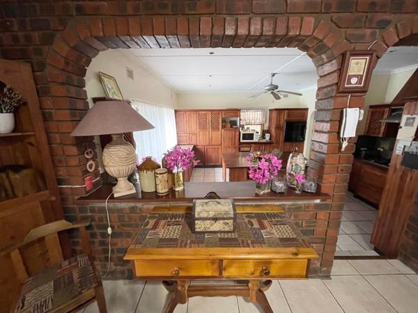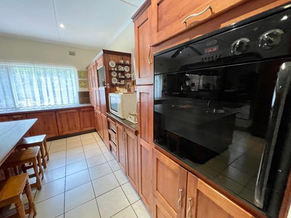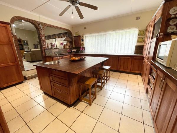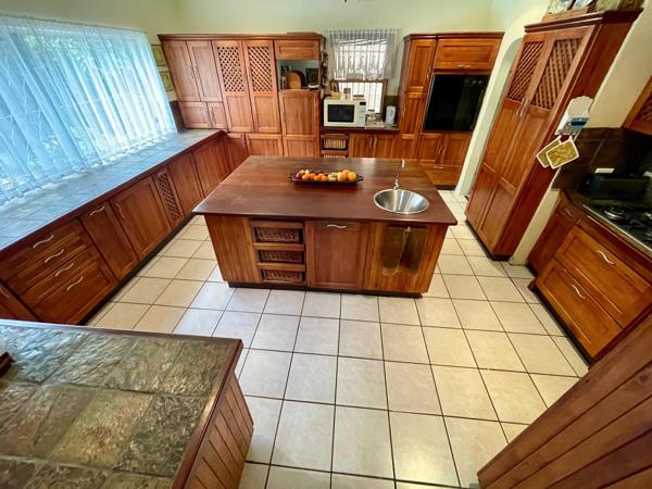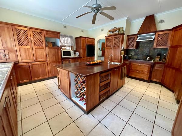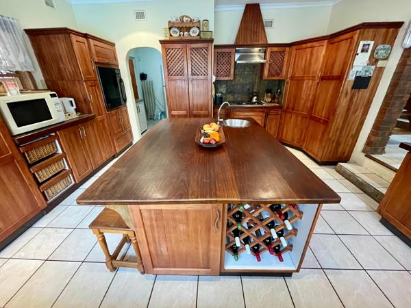 The open-plan living space consisting of a dining area that overlooks the main lounge is enhanced even further with its stunning high ceilings. The solid-saligna wood kitchen cupboards & center-island with built-in prep-bowl, storage draws & wine-rack are a sight to behold in this large gourmet kitchen with separate scullery. A place for everything & everything in its place.