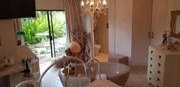 Outdoor living is a delight with a large swimming pool surrounded by tropical landscaping and brick paving, perfect for enjoying the South African climate. The property also includes a lapa with a built-in braai, ideal for entertaining. Practical amenities include three garages, a laundry room, air conditioning, and an access gate. A separate flatlet adds further value and flexibility.