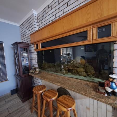 The entertainment area features a built-in braai, a welcoming boma, and a peaceful fountainpond perfect for relaxed evenings or weekend get-togethers with friends and family.