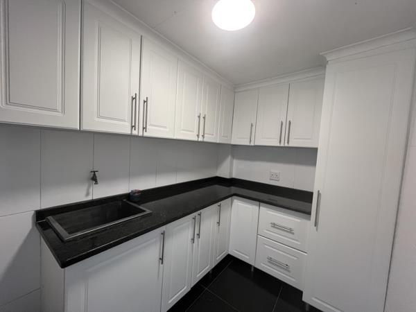 The modern kitchen is a true highlight, featuring crisp white cabinetry, elegant white quartz countertops, and a seamless finish. For added convenience, theres a separate scullery and a laundry fitted with cupboards and a wash basin.