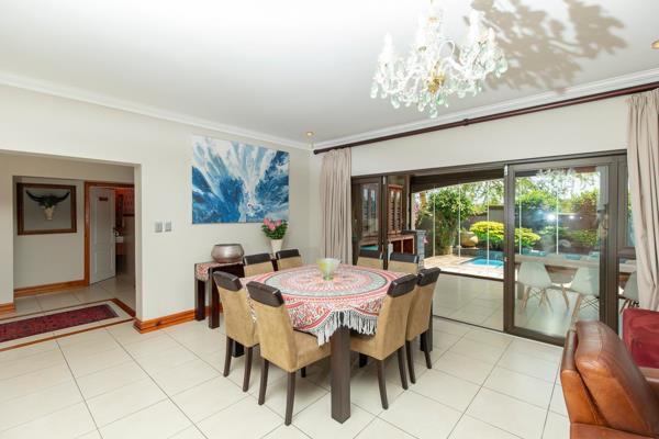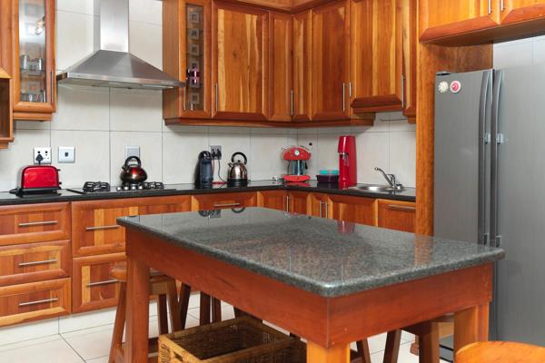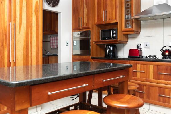 The ground floor is designed for both family living and entertaining, featuring a spacious open-plan layout with a fully fitted solid-wood kitchen, separate scullerylaundry, and living area that flows seamlessly onto two outdoor spaces, a private patio on one side and a magnificent entertainment area with built-in braai on the other.