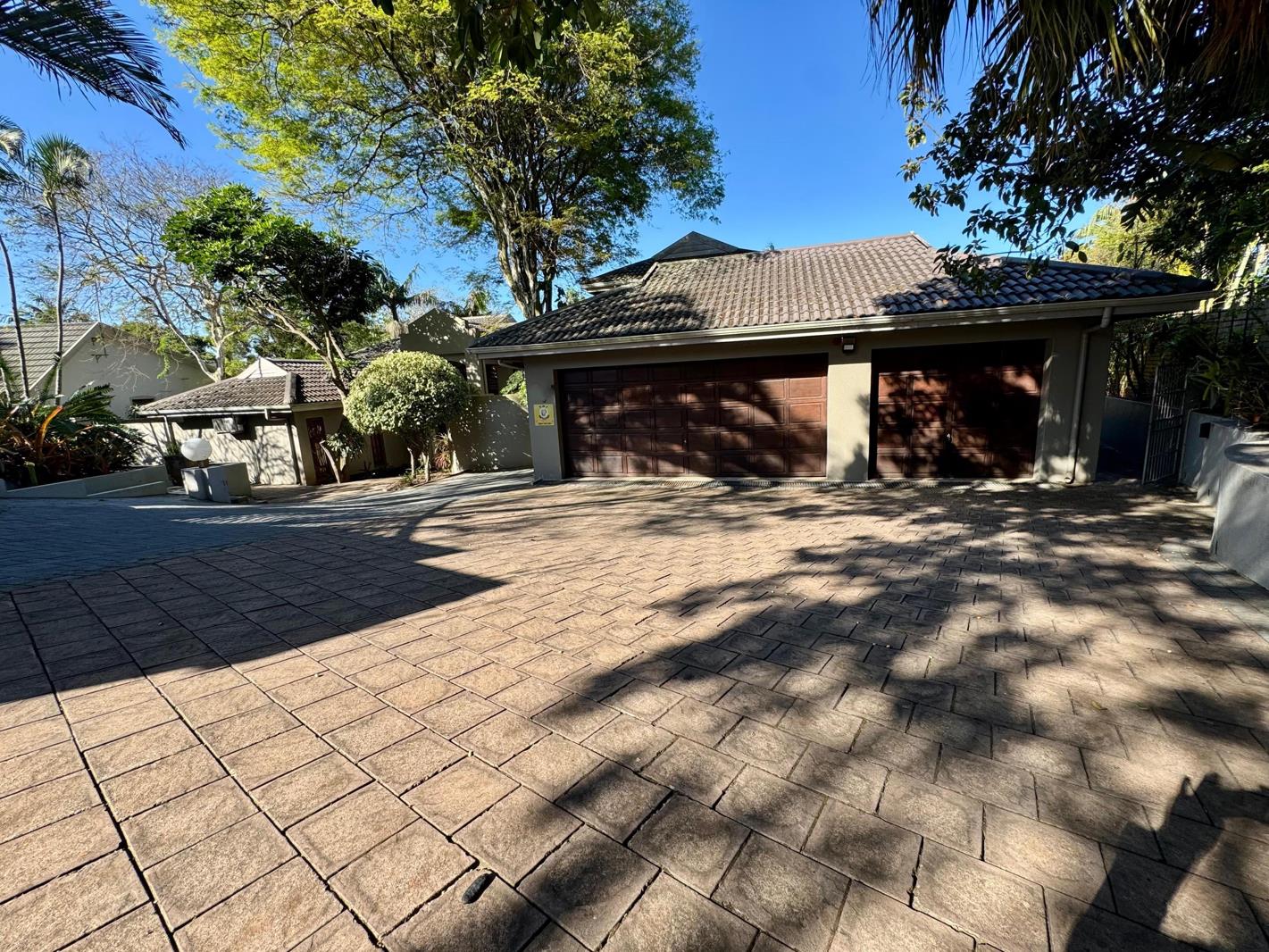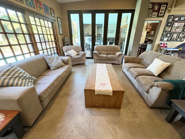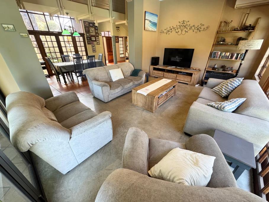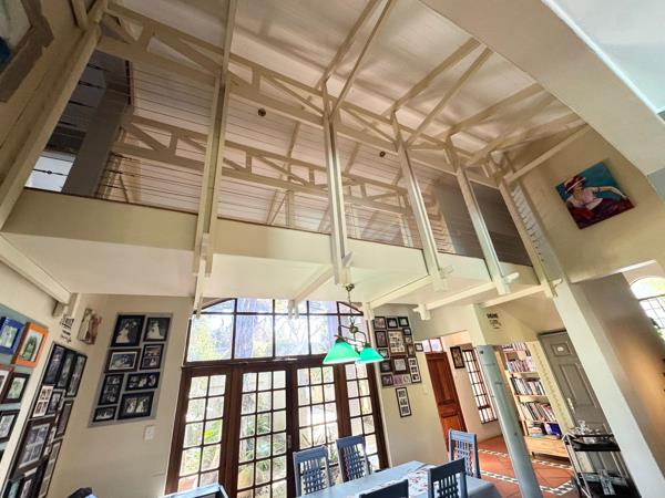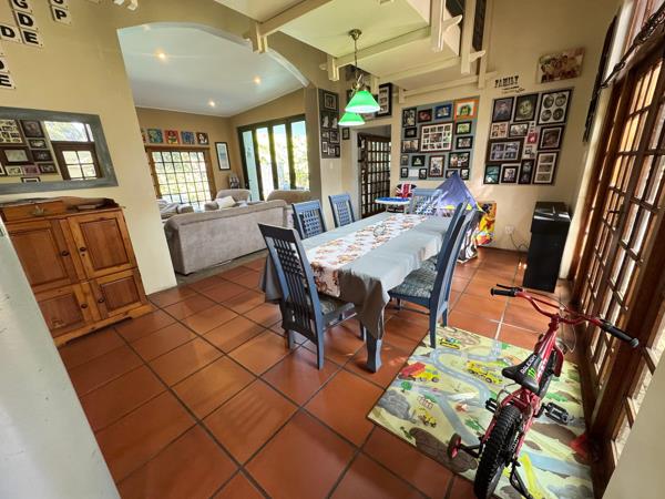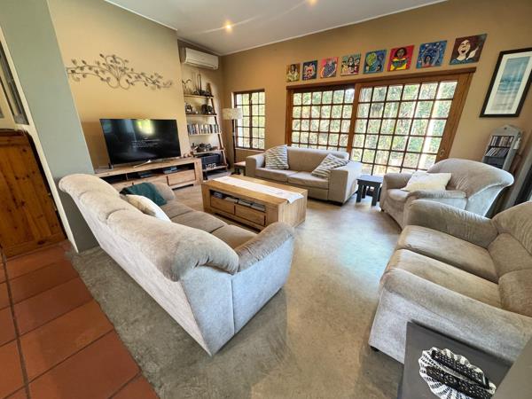 The main residence features four spacious bedrooms, with one en-suite downstairs and three upstairs. The master suite is a true retreat, enjoying serene views of the lush garden and sparkling blue pool. The upper level is completed with two additional large bedrooms, a shared bathroom, and a flexible office, hobby, or TV lounge space. The heart of the home is the open-plan living and dining areas, both of which flow seamlessly onto the undercover entertainment patio complete with a built-in braai. The well-appointed kitchen is a standout, offering solid wood cupboards, granite countertops, a double eye-level oven, 5-burner gas hob on a stunning centre island, and a separate laundry for convenience.