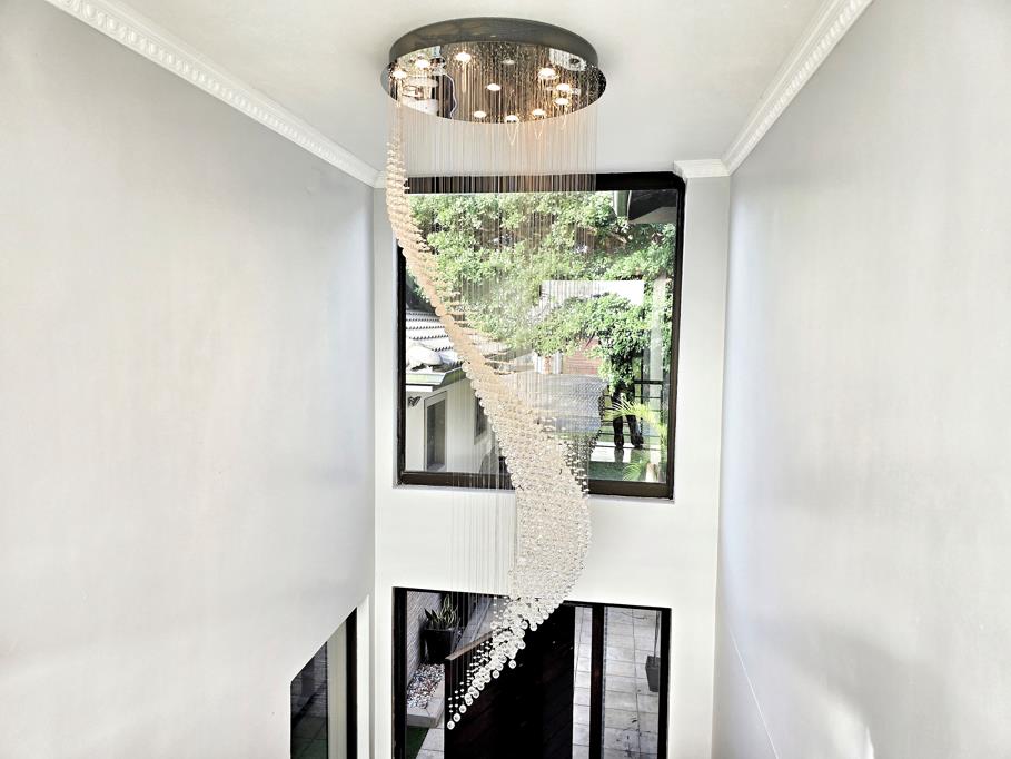 Welcome to your dream home in the esteemed Mzingazi Golf Estate. As you step through the grand entrance, you are greeted by a dazzling chandelier that sets the tone for the elegance within. A magnificent winding staircase with a double-story window provides breathtaking views of the golf course, adding a touch of grandeur to every moment. With tiles imitating white marble, every step will feel like luxury.