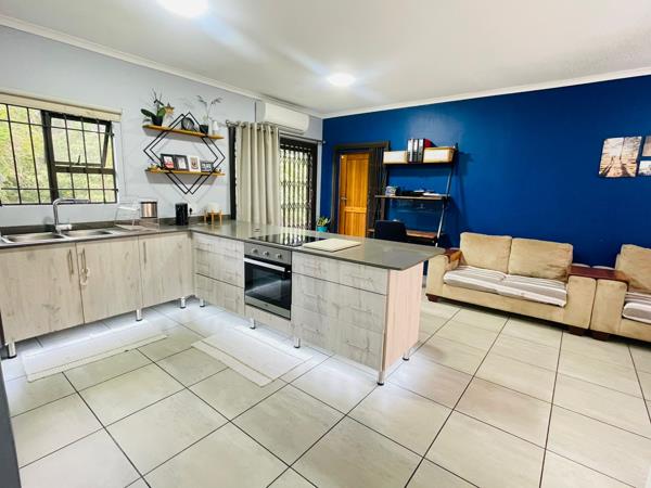 The open-plan living area flows seamlessly into a stunning modern kitchen fitted with battery-operated lights on the cupboards a clever feature that keeps the space bright even during load shedding.