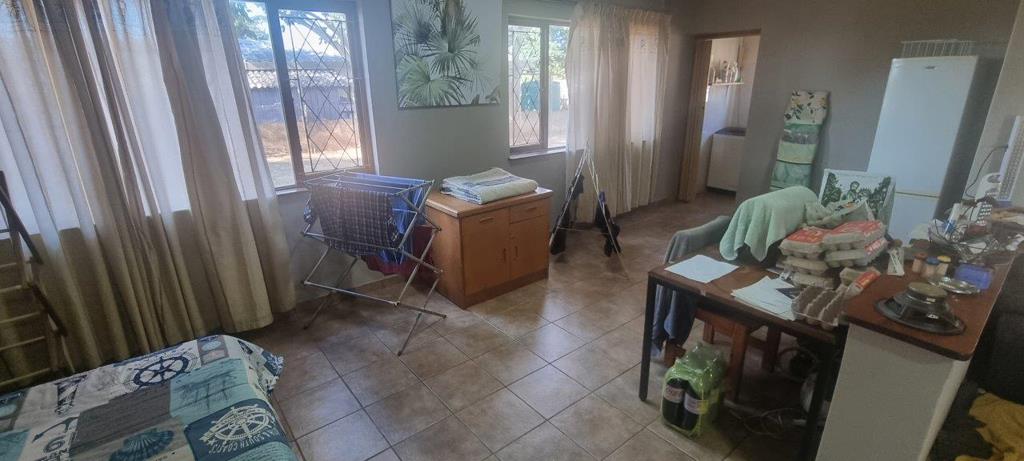 The home offers 2 bedrooms and 2 bathrooms, with an open-plan living area and kitchen. The room next to lounge currently dining roombedroom could be converted into a 3rd bedroom if desired because the second bathroom is off this room. The property includes a generously sized stand, perfect for gardening enthusiasts to create their dream garden. Additionally, it features a double garage, a servants'' room with a bathroom, and is completely fenced for security. The property also has backup water supply.