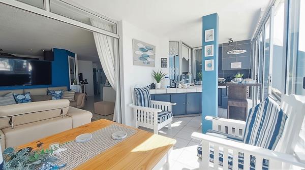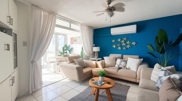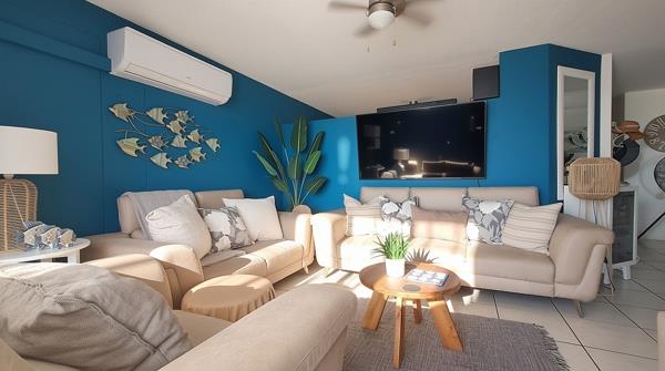 The open-plan layout seamlessly connects the lounge, dining area, and a well-appointed kitchen, creating a bright and airy atmosphere. A distinct nautical theme enhances the coastal ambiance throughout, complemented by abundant natural light. Modern comforts include air conditioning and special doors, ensuring a pleasant environment year-round.