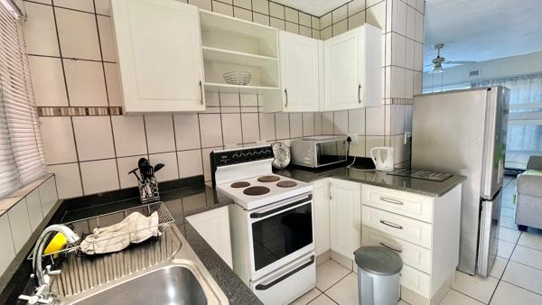 This open plan corner apartment has a spacious living area and a balcony with a built in braai and great sea views. Immaculate kitchen and tiled throughout. This studio is perfect for holiday letting or as a lock up and go holiday apartment. Within walking distance to Lucien Beach and close to all amenities.