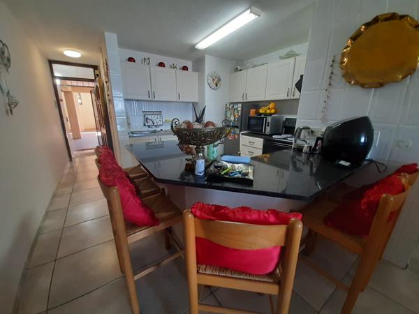 Beautiful open plan kitchen with Granite countertops, built-in breakfast nook, overlooking the ocean through the lounge area. So you will always be with your guests while entertaining. From the lounge, you go onto a big balcony with built-in braai which leads around to the main Bedroom. The main bedroom is a complete main en suite with a Bath, Basin, and Toilet.