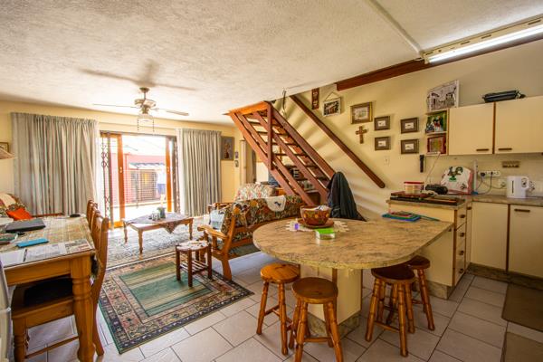 Upon entering, you are welcomed by a charming lounge featuring high wooden ceilings that create an inviting ambiance. This space flows effortlessly into an open-plan kitchen, thoughtfully designed for both practicality and social engagement. The kitchen opens directly to an outdoor courtyard equipped with a basin, a covered built-in braai, and a convenient outdoor toiletideal for entertaining guests or enjoying family gatherings. The ground level also boasts two well-appointed bedrooms, complemented by a conveniently located bathroom, ensuring comfort and privacy for all residents.