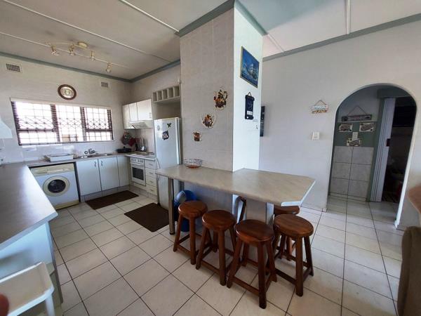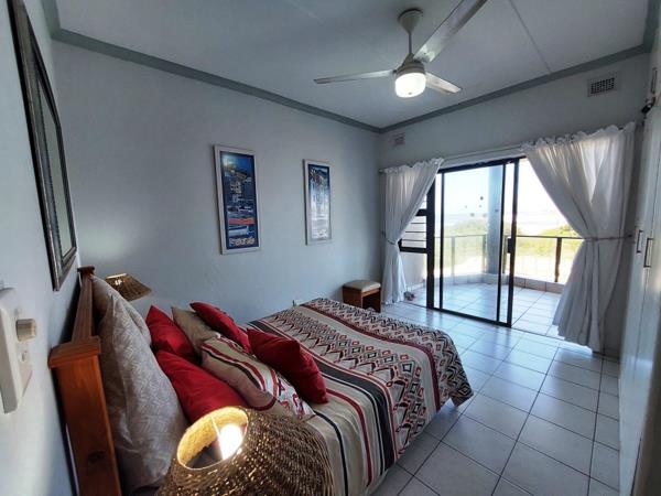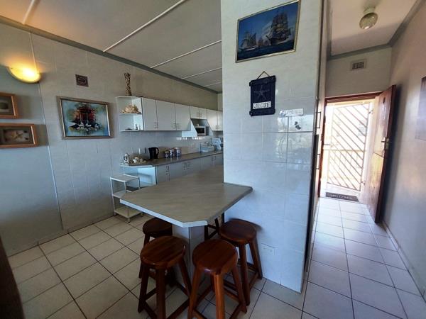 breakfast nook. It flows effortlessly into the spacious lounge, which opens onto a private balcony with a built-in braai perfect for entertaining or enjoying morning coffee with stunning ocean and breaker views.