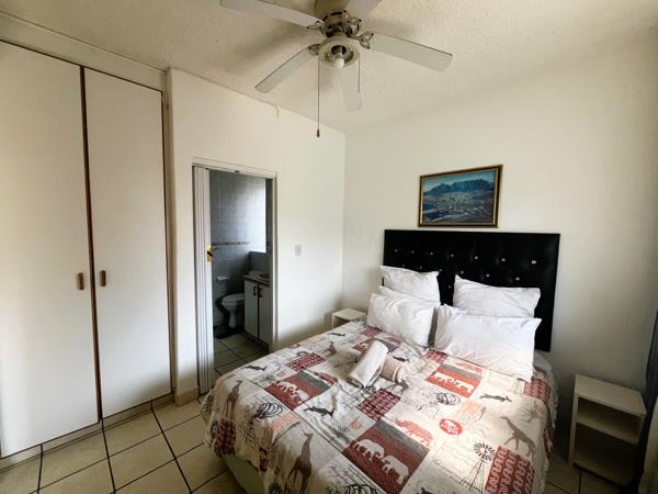 The interior features a light-filled open-plan lounge and dining area, a practical kitchen with built-in cupboards and ceiling fans for added comfort. The main bedroom includes an en-suite bathroom, while the second bedroom enjoys direct access to the semi-covered balconyideal for enjoying your morning coffee or evening breeze with a sea view.