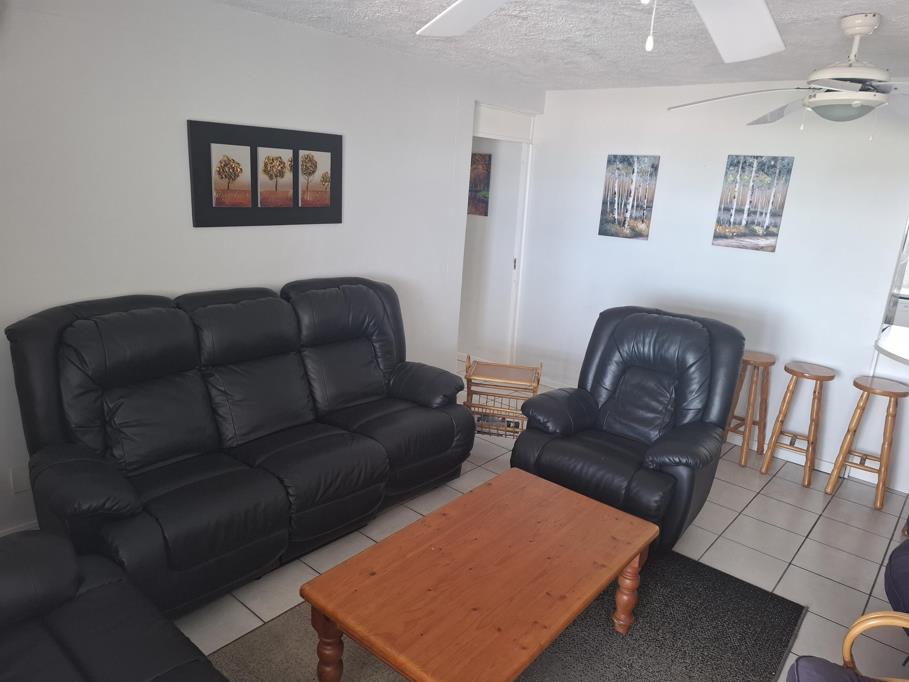 Offering three large bedrooms, this unit comfortably sleeps eight people. The main bedroom features a queen-size bed, air-conditioning, a full en-suite bathroom with both bath and shower, and direct access to the balcony with calming ocean views. The remaining two bedrooms are spacious, equipped with fans, and share a neat second bathroom.