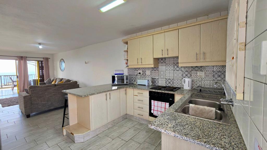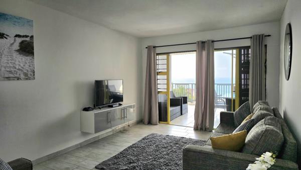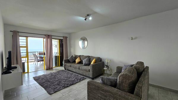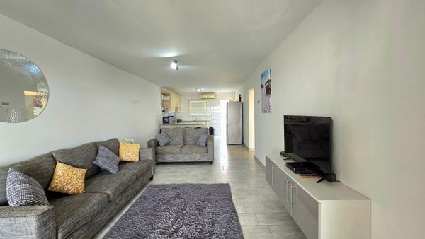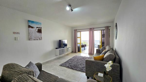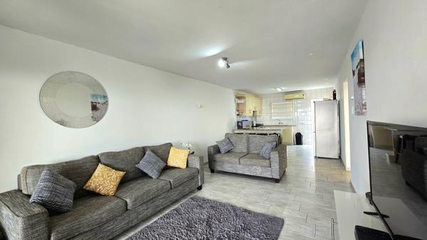 The unit features 2 bedrooms and 2 bathrooms, including a main en-suite. The open-plan living area and fully equipped kitchen are tiled throughout and come with an air conditioner. Both the main bedroom and the lounge have access to the balcony that spans the length of the apartment. Furniture is available for purchase separately. The unit includes a single garage, with additional open parking available for visitors.