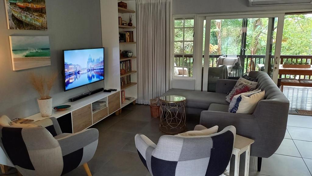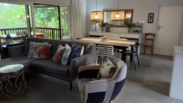 Sliding doors give access to the hardwood deck, overlooking the abundant greenery and providing another stress-free living area.