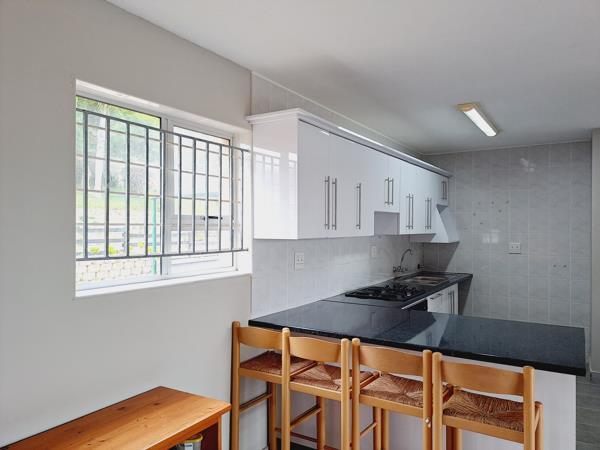 The newly renovated kitchen boasts sleek white gloss cupboards, granite countertops, an under-counter oven, hob, and extractor hood. It also includes a bar counter with stools, creating an inviting space that flows seamlessly into the living area. The tiled lounge extends to a spacious balcony, perfect for relaxing and enjoying the tranquil surroundings.