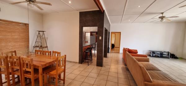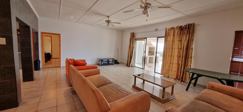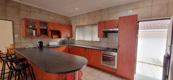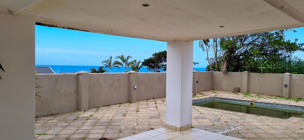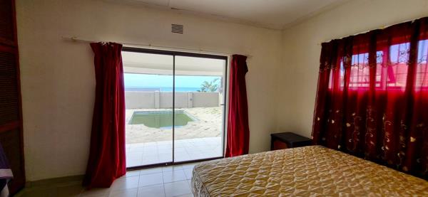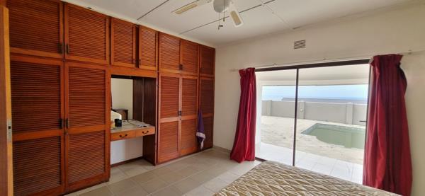All on one level and tiled throughout this property has a fully fitted modern kitchen that boasts ample built-in cupboards, built-in oven, hob, extractor fan and pantry cupboard. A separate scullery with laundry facilities is set next to the kitchen, which leads to a large room that can be an office or extra sleeping quarters. The kitchen is open-plan to the lounge and dining area and overlooks a generous sized undercover patio with built-in braai, swimming pool and an awesome sea-view background. Down the passage is three spacious bedrooms, all with built-in cupboards and ceiling fans. The main is en-suite with a double size shower. The other bedrooms are serviced by two bathrooms. Four of the bedrooms have patio access through aluminum sliding doors and enjoy sea-views. If you dont need the extra two bedrooms, you could convert this back into a double garage. Additional features include a spacious garden, two parking spaces behind the remote access gate. While the property may need a touch of tender loving care, its exceptional value makes it a good investment opportunity. This property is only a two minute drive to the beach. Close to all amenities, shops, malls and schools.