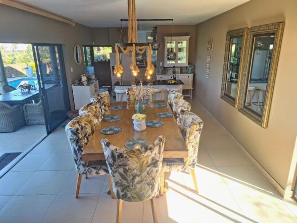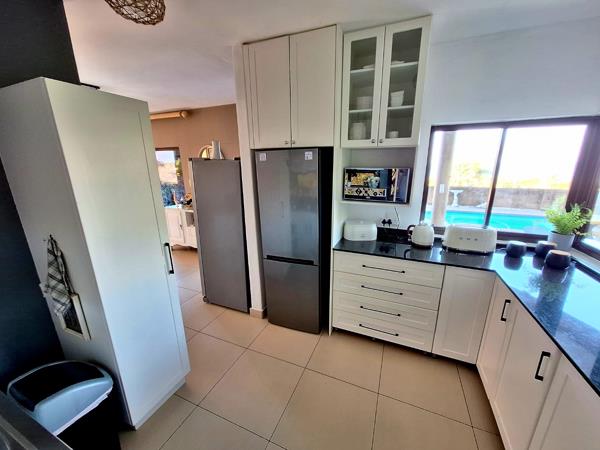 FIRST FLOOR: As you walk up the stairway you are welcomed into the spacious lounge and dining area, the open plan concept allows for uninterrupted entertaining space as the dining room flows into your modern kitchen, and onto the covered patio area. The patio area and garden creates a private oasis with built-in braai, swimming pool, all surrounded by lush greenery.