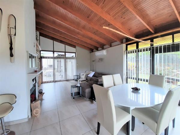 This home has spectacular finishes throughout. The large open plan living, dining and kitchen has plenty of light, high wooden ceilings, air-conditioning, a warm fireplace next to which is a wall filled with bookshelves. The doors leading from the dining area open to a lovely covered veranda with distant sea views. The doors leading from the lounge open to a private courtyard with a built in braai and a large table for outside dining.