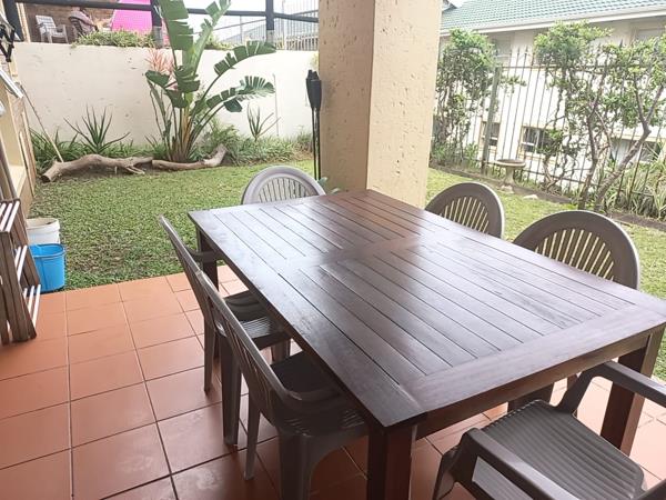 The lounge has good quality couches and chairs. The large patio flows out from the lounge. It has a patio table and chairs. It is covered, and you can step onto the large patch of lawn from here.
